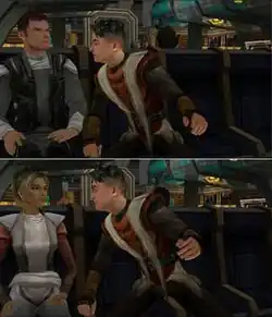 - ^ Tavion was also featured as a secondary antagonist in Jedi Outcast. She was the apprentice of the main antagonist, Desann, whom Kyle defeated and spared, leading her to swear revenge on him for humiliating her.