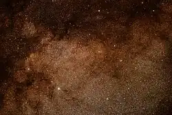 Technically not star clusters, star clouds are large groups of many stars within a galaxy, spread over very many light-years of space. Often they contain star clusters within them. The stars appear closely packed, but are not usually part of any structure.[19] Within the Milky Way, star clouds show through gaps between dust clouds of the Great Rift, allowing deeper views along our particular line of sight.[20] Star clouds have also been identified in other nearby galaxies.[21] Examples of star clouds include the Large Sagittarius Star Cloud, Small Sagittarius Star Cloud, Scutum Star Cloud, Cygnus Star Cloud, Norma Star Cloud, and NGC 206 in the Andromeda Galaxy.