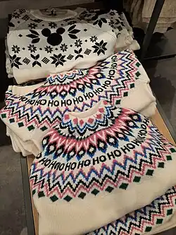 In European textiles a common eight-pointed star design is known as the Holy Star of Bethlehem. The design has been used in stone, metal, wood-work and embroidery in the Middle East since antiquity and is one of the oldest patterns in Palestinian tatreez embroidery.[137] In 2019 US congresswoman Rashida Tlaib was sworn in wearing a thobe that featured the design.[138] On Vogue Arabia's November 2023 cover the star took a central position in the celebration of Palestinian embroidery.[139] The design also features on Christmas sweaters.