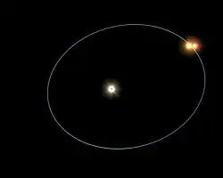 For example, stable trinary systems consist of two stars in a close binary system, with a third orbiting this pair at a distance much larger than that of the binary orbit.[16][13] If the inner and outer orbits are comparable in size, the system may become dynamically unstable, leading to a star being ejected from the system.[17] EZ Aquarii is an example of a physical hierarchical triple system, which has an outer star orbiting an inner binary composed of two more red dwarf stars.