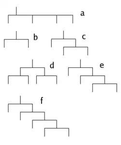 Hierarchical arrangements can be organized by what Evans (1968) called mobile diagrams, which look similar to ornamental mobiles hung from the ceiling. Each level of the mobile illustrates the decomposition of the system into two or more systems with smaller size. Evans calls a diagram multiplex if there is a node with more than two children, i.e. if the decomposition of some subsystem involves two or more orbits with comparable size. Because multiplexes may be unstable, multiple stars are expected to be simplex, meaning that at each level there are exactly two children. Evans calls the number of levels in the diagram its hierarchy.[13]