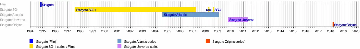 | Television series | Stargate SG-1 (1997–2007) Stargate Atlantis (2004–2009) Stargate Universe (2009–2011) |