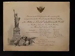 No members of the general public were permitted on the island during the ceremonies, which were reserved entirely for dignitaries. The only women granted access were Bartholdi's wife and Lesseps's granddaughter; officials stated that they feared women might be injured in the crush of people. The restriction offended area suffragists, who chartered a boat and got as close as they could to the island. The group's leaders made speeches applauding the embodiment of Liberty as a woman and advocating women's right to vote.[124] A scheduled fireworks display was postponed until November 1 because of poor weather.[126]