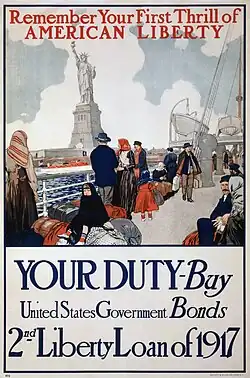 After the United States entered World War I in 1917, images of the statue were heavily used in both recruitment posters and the Liberty bond drives that urged American citizens to support the war financially. This impressed upon the public the war's stated purpose—to secure liberty—and served as a reminder that embattled France had given the United States the statue.[138]