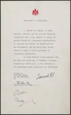 - ^ Wade, E. C. S. (June 1937). "Declaration of Abdication Act, 1936". Modern Law Review. 1 (1): 64–66. JSTOR 1089160.