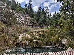 Steamboat is home to several natural hot springs that are located throughout the area (see Geography). Upon first hearing a chugging sound, early trappers believed that a steamboat was coming down the river. When the trappers saw that there was no steamboat, and that the sound was coming from a hot spring, they decided to name the spring Steamboat Spring.[15]