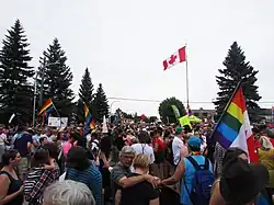 During March 2013, the city gained national attention when several community members, such as the Southland Community Church and Steinbach Christian High School expressed opposition to provincial Bill 18, an anti-bullying bill that would require the accommodation of gay-straight alliance groups in schools, including faith-based private schools.[39] On 13 September 2013, Bill 18 passed without amendments.[40] Partially in response to this issue, the city's first Steinbach Pride parade was held in 2016. While initially expecting about 200 people, approximately 3,000 people attended the event. This was brought about in part by the fact that not a single elected official from the area attended or endorsed the event.[41][42][43][44]