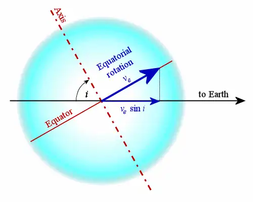 The component of the radial velocity observed through line broadening depends on the inclination of the star's pole to the line of sight. The derived value is given as , where is the rotational velocity at the equator and is the inclination. However, is not always known, so the result gives a minimum value for the star's rotational velocity. That is, if is not a right angle, then the actual velocity is greater than .[2] This is sometimes referred to as the projected rotational velocity. In fast rotating stars polarimetry offers a method of recovering the actual velocity rather than just the rotational velocity; this technique has so far been applied only to Regulus.[3]