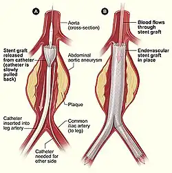 A stent graft or covered stent is type of vascular stent with a fabric coating that creates a contained tube but is expandable like a bare metal stent. Covered stents are used in endovascular surgical procedures such as endovascular aneurysm repair. Stent grafts are also used to treat stenoses in vascular grafts and fistulas used for hemodialysis.