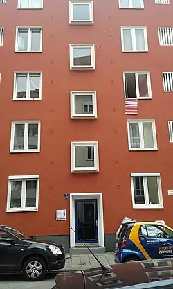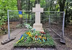The MGB, and from 1954, the Soviet KGB, had attempted to kidnap or assassinate Bandera multiple times.[108] On 15 October 1959, Bandera was returning to his apartment at Kreittmayrstrasse 7 in Munich, where he collapsed and died shortly thereafter. A medical examination established that the cause of his death was poisoning by cyanide gas.[109][110] On 20 October 1959, Bandera was buried in the Waldfriedhof (lit. 'woodland cemetery') in Munich.[111] His wife and three children moved to Toronto, Canada.[112]