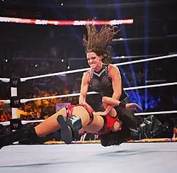 In June 2014, as part of the ongoing storyline with Bryan, McMahon threatened to fire his wife Brie Bella if Bryan did not relinquish the WWE World Heavyweight Championship, which forced Brie to quit before slapping McMahon in the face.[94] On the June 16 episode of Raw, Roman Reigns spiked the coffee Vickie Guerrero gave to McMahon, causing Stephanie to throw up on Vickie and leave with Triple H to the hospital. Vickie later gave Reigns a chance in the battle royal, which he would win.[95] On the June 23 episode of Raw, Vickie lost in a pudding match against McMahon with her job on the line, after interference by Alicia Fox, Layla and Rosa Mendes. Vickie ultimately lost the match and was fired; however, she got her retribution over McMahon by throwing her into the mud pool.[96] After Brie quit, McMahon put Brie's sister Nikki in several handicap matches as punishment.[97][98][99][100] Brie returned to television on the July 21 episode of Raw, appearing in the crowd leading to a confrontation between the two. McMahon was (kayfabe) arrested and charged with assault and battery, because she slapped Brie, who was not a (kayfabe) WWE employee.[101] The following week, McMahon granted Brie her job back and a match at SummerSlam against her to get Brie to drop the lawsuit.[102] On the August 4 episode of Raw, after their contract signing, McMahon pedigreed both twins.[103] At SummerSlam, Nikki turned on Brie, allowing Stephanie to hit a pedigree on Brie having Stephanie win her first pay per view match in over 10 years.[104]