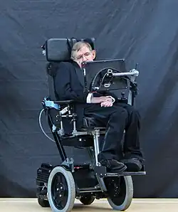 When Hawking first began using a wheelchair he was using standard motorised models. The earliest surviving example of these chairs was made by BEC Mobility and sold by Christie's in November 2018 for £296,750.[266] Hawking continued to use this type of chair until the early 1990s, at which time his ability to use his hands to drive a wheelchair deteriorated. Hawking used a variety of different chairs from that time, including a DragonMobility Dragon elevating powerchair from 2007, as shown in the April 2008 photo of Hawking attending NASA's 50th anniversary;[267] a Permobil C350 from 2014; and then a Permobil F3 from 2016.[268]