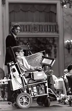 Hawking's speech deteriorated, and by the late 1970s he could be understood by only his family and closest friends. To communicate with others, someone who knew him well would interpret his speech into intelligible speech.[269] Spurred by a dispute with the university over who would pay for the ramp needed for him to enter his workplace, Hawking and his wife campaigned for improved access and support for those with disabilities in Cambridge,[270][271] including adapted student housing at the university.[272] In general, Hawking had ambivalent feelings about his role as a disability rights champion: while wanting to help others, he also sought to detach himself from his illness and its challenges. His lack of engagement in this area led to some critics saying he was not doing enough, although White and Gribbin note "just by staying alive and continuing to work at the intense rate he and the world have grown used to, he is an inspiration to handicapped people everywhere".[273]