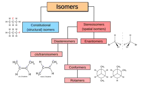 Isomers are of two types: diastereomers (also called diastereoisomers) and enantiomers. Enantiomers are non-superimposable mirror images. Diastereomers are all other types of isomers.