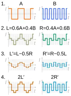 • Using hybrid transformers to matrix between left and right signals and sum and difference signals;