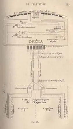Diagram of Clément Ader's théatrophone prototype at the Opera during the World Exhibition in Paris (1881)