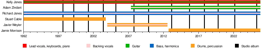 Everett went on holiday for two weeks but Jones and Cable wanted to continue rehearsing, so Jones invited long-time friend Richard Jones to fill in for Everett.[15] Stunned by Richard's appearance and bass playing, Cable convinced Kelly to keep him instead of Everett.[15] The band decided they needed another member to play lead guitar. Simon Collier was the first guitarist brought in. He did not stay in the band, but instead became Kelly's guitar technician.[16] The band tried hiring two other guitarists, another Richard Jones and Glenn Hyde.[17] Neither stayed for long. Hyde did, however, play harmonica on "Rooftop" for the band's 2001 album Just Enough Education to Perform.[17] After Hyde left, the band stuck as a three-piece act.[17]