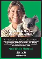 Irwin was involved in several media campaigns. He enthusiastically joined with the Australian Quarantine and Inspection Service to promote Australia's strict quarantine requirements, with advertisements and posters featuring slogans such as, 'Quarantine Matters! Don't muck with it'. His payments for these advertising campaigns were directed into his wildlife fund.[52]