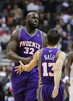 Nash played in 81 regular season games during the 2007–08 season; in this campaign, the Western Conference was especially competitive and he led the Suns to 55 wins and the sixth seed for the 2008 playoffs. Although there was a dip in his regular season output, Nash's shooting remained sharp; the accuracy of his shooting was on par with his 2005–06 MVP campaign (shooting at least 50% from the field, 40% from the three-point arc, and 90% from the free throw line).[15] On 31 January 2008, he collected his All-Star stripes for the sixth time in his career.[40] However, Nash continued to experience agony in the playoffs. Despite a mid-season trade that sent Shawn Marion to the Miami Heat and brought four-time NBA champion Shaquille O'Neal to the team, the Suns were defeated in the first round of the 2008 playoffs by the San Antonio Spurs for the third time in four years.[41] In the deciding Game 5, Nash was perceived to have suffered from "elimination-game jitters", and turned over the ball twice in the final two minutes of what was a tight contest.[41] Nevertheless, Nash was later named to the All-NBA Second Team for the 2007–08 season.[42]