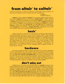 As a joke, Wozniak decided to print "20,000 brochures" (according to YouTube video "Rare video of Steve Wozniak from 1984 talking about computing, joining Apple and the Mac" filmed at a Cleveland computer club meeting) of a fake product called the 'Zaltair' with a lot of "superlative descriptions of a computer that solved every problem in the world".[40] It advertised, among other things, a new version of the BASIC programming language called "BAZIC", with the ability to "define your own language... a feature we call perZonality".[41]