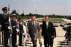Spielberg's 1998 release was World War II epic Saving Private Ryan, about a group of US soldiers led by Captain Miller (Tom Hanks) sent to bring home a paratrooper whose three older brothers were killed in the same twenty-four hours of the Normandy landing. Filming took place in England, and US Marine Dale Dye was hired to train the actors and keep them in character during the combat scenes. Halfway through filming, Spielberg reminded the cast that they were making a tribute to thank "your grandparents and my dad, who fought in [the war]".[168] Upon release, critics praised the direction and its realistic portrayal of war.[169] The film grossed a successful $481 million worldwide[170] and Spielberg won a second Academy Award for Best Director.[171] In August 1999, Spielberg and Hanks were awarded the Distinguished Public Service Medal from Secretary of Defense William S. Cohen.[168][172] Thomson writes "Ryan changed war films: combat, shock, wounds, and fear had never been so graphically presented; and yet there was also a true sense of what duties and ideas had felt like in 1944. I disliked the framing device. I would have admired a director who trusted us to get there without that. Never mind—Ryan is a magnificent film."[74] Ebert wrote "Spielberg knows how to make audiences weep better than any director since Chaplin in City Lights. But weeping is an incomplete response, letting the audience off the hook. This film embodies ideas. After the immediate experience begins to fade, the implications remain and grow."[173]