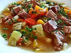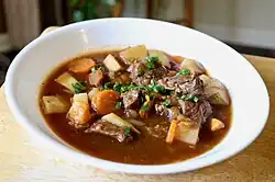 | Main ingredients | Vegetables (carrots, celery, parsnips, potatoes, onions, beans, mushrooms, etc.), meat (such as beef), and a liquid such as water, wine, beer or stock |