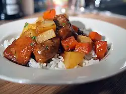 A stew is a combination of solid food ingredients that have been cooked in liquid and served in the resultant gravy. Ingredients can include any combination of vegetables and may include meat, especially tougher meats suitable for slow-cooking, such as beef, pork, venison, rabbit, lamb, poultry, sausages, and seafood. While water can be used as the stew-cooking liquid, stock is also common. A small amount of red wine or other alcohol is sometimes added for flavour. Seasonings and flavourings may also be added. Stews are typically cooked at a relatively low temperature (simmered, not boiled), allowing flavours to mingle.