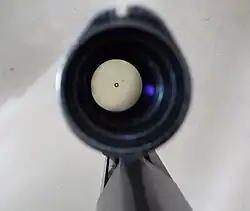 The AUG has a 1.5× telescopic sight that is integrated with the receiver casting and is made by Swarovski Optik. It contains a simple black ring reticle. The sight cannot be set to a specific range but can be adjusted for windage and elevation for an initial zero and is designed to be calibrated for 300 m. It also has a backup iron sight with a rear notch and front blade, cast into the top of the aluminium optical sight housing, in case of failure or damage to the primary optical sight. The sight is also equipped with a set of three illuminated dots (one on the front blade and two at the rear) for use in low-level lighting conditions. In order to mount a wide range of optics and accessories, a receiver with a NATO-standard Picatinny rail and detachable carrying handle was also developed and introduced in December 1997.[10] Modern AUGs are equipped with, or can have the Picatinny rail swapped out with, an A3SF 60mm height ×3 optic with optional riser and additional crosshair within the "donut" black ring. This specific optic can be piggybacked with other optics on top, as is the norm with Austrian special forces, due to the Picatinny rail included on top of the optic.[17]
