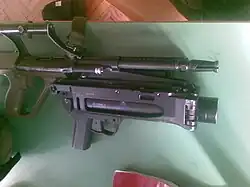 The Steyr AUG 9mm, also known as the AUG Para, is a submachine gun variant of the AUG chambered for the 9×19mm Parabellum cartridge and has been produced since 1988.[1] It differs from the rifle variants by having a unique 420 mm (16.5 in) barrel with six right-hand grooves at a 250 mm (1:9.8 in) rifling twist rate, with a recoil compensator, a slightly different charging handle, and a magazine well adapter enabling the use of Steyr MPi 69 25- and 32-round box magazines. It is blowback-operated and fires from a closed bolt, omitting the original rifle's gas system.[27][28] A conversion kit used to transform any assault rifle configuration into the submachine gun configuration is also available. The conversion kit consists of a barrel, bolt, adapter insert, and magazine.