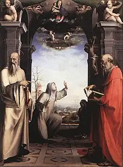 St. Francis of Assisi is widely considered the first recorded stigmatic in Christian history.[19] In 1224,[20] two years before his death, he embarked on a journey to Mount La Verna for a forty-day fast. The legend states that one morning, near the feast of the Exaltation of the Cross, a six-winged angel appeared to Francis while he prayed. As the angel approached, Francis could see that the angel was crucified. He was humbled by the sight, and his heart was filled with elation joined by pain and suffering. When the angel departed, Francis was left with wounds in his hands, feet, and side as if caused by the same lance that pierced Christ's side. The image of nails immediately appeared in his hands and feet, and the wound in his side often seeped blood.[21] Pope Alexander IV and other witnesses declared that they had seen these marks both before and after his death.[20] In traditional artistic depictions of the incident, Francis is accompanied by a Franciscan brother.[22]