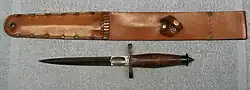World War II saw a resurgence of the stiletto in the form of combat knives for commando raiding forces and other troops who needed a weapon for silent killing.[29] In late 1940, the famed British hand-to-hand combat instructors William E. Fairbairn and Eric A. Sykes designed the Fairbairn–Sykes fighting knife, a double-edged dagger with a long narrow point designed to optimize the blade for thrusting, though it was also capable of slashing strokes if the cutting edges were sharpened.[30]