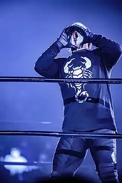 Declaring he would visit "from time to time",[34] Sting threw the microphone down and left the ring. Days after the infamous promo, he was booked for shows in New Japan Pro-Wrestling, to take part in the Japan/U.S. Superstars Tournament, where he defeated Masahiro Chono in the first round, but was eliminated in the second round by Shiro Koshinaka. His last match of 1996 took place on September 23 at the Yokohama Arena, where he and Lex Luger teamed up to defeat Arn Anderson and Steven Regal. It would end up being his last tour of Japan. On the October 21 episode of Nitro, Sting returned for the first time since the night after Fall Brawl in a match where the impostor Sting was wrestling Mr. JL. Sting emerged wearing a trench coat and white face paint with black marks around his eyes. He went in the ring and attacked nWo Sting (who was still imitating Sting's old mannerisms at this point) with his new finisher, an inverted DDT dubbed the Scorpion Death Drop, two jumping elbow drops, a Stinger Splash and a Scorpion Deathlock while the rest of the nWo stood around ringside. Rather than intervene and save their stablemate, they simply stood by and watched. After Sting was done, the nWo came into the ring. Ted DiBiase, Scott Hall, and Kevin Nash made Sting an offer to join the nWo and get back at WCW for betraying him. Sting, after a slight pause, first called out the nWo Sting as a "cheap imitation," before telling the nWo, "the real Sting may or may not be in your price range," and then concluded by saying "the only thing that's for sure about Sting is nothing's for sure". With that, Sting left the ring and would not speak (on the microphone) on WCW programming again for over a year. A silent, almost ghostly Sting, carrying a baseball bat as a weapon, began appearing in the rafters at WCW events and began painting his entire face with black and white corpse paint. In retaliation, nWo Sting, who was still imitating Borden, began painting his face this way as well. Sting's new gimmick was directly inspired by the title character of the 1994 film The Crow starring Brandon Lee portraying the film character, and Borden credits Scott Hall for suggesting the idea of the "Crow" character.[35] Sting still maintains the core aspects and aesthetic of his "Crow" persona to this day, occasionally with different designs and use of color integrated into the face paint.