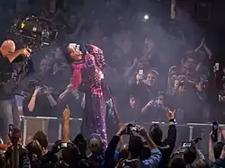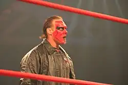 On October 12 at Bound for Glory IV, Sting defeated Samoa Joe to win the TNA World Heavyweight Championship after Kevin Nash returned and hit Joe with Sting's baseball bat.[58] After Bound for Glory, Sting, along with Kurt Angle, Booker T, Kevin Nash and Scott Steiner created The Main Event Mafia, a stable formed by veterans and former World Champions. The faction feuded with younger wrestlers, dubbed the TNA Frontline. Sting defended the title against Frontline's AJ Styles at Turning Point on November 9 and Rhino on January 11, 2009, at Genesis. Sting also feuded with the leader of The Main Event Mafia Kurt Angle. At Against All Odds on February 8, Sting defended the title against Angle, Brother Ray and Brother Devon. He then faced off with Angle in a singles match at Destination X on March 15.[59][60][61][62] At Lockdown on April 19, Sting lost the TNA World Heavyweight Championship to Mick Foley inside the Six Sides of Steel, ending his reign at 189 days (his longest world title reign for any organization).[63] On May 24 at Sacrifice, Sting defeated Kurt Angle to become the new "godfather" of the Main Event Mafia.[64] On June 21 at Slammiversary, Sting defeated Matt Morgan in a singles match, thus preventing Morgan from joining the Main Event Mafia.[65] On the following episode of Impact!, Sting's fellow Main Event Mafia members attacked him, removing him from the group, and Kurt Angle reclaimed his role as "godfather". The following week, Sting took his revenge upon the Mafia, when he attacked every member of the group and stole Angle's world heavyweight championship belt, becoming a full-fledged face as a result. On July 19 at Victory Road, Sting was defeated by new Main Event Mafia member Samoa Joe in a singles match after the debuting Taz interfered on Joe's behalf.[66] On August 16 at Hard Justice, Sting unsuccessfully challenged Angle for the TNA World Heavyweight Championship in a triple threat match, which also included Matt Morgan.[67] On September 20 at No Surrender, Sting lost a five-way match for the TNA World Heavyweight Championship that also included AJ Styles, Hernandez, Kurt Angle, and Matt Morgan. Instead of pinning Angle, he opted to attack Morgan, allowing Styles to pin Angle and become the new TNA World Heavyweight Champion.[68] As a token of gratitude, Styles offered to give him a title shot at the following month's PPV Bound for Glory on October 18 in a match billed as possibly being Sting's retirement match.[69] At Bound for Glory, Styles defeated Sting to retain his title, ending Sting's undefeated streak at Bound for Glory. After the match, Sting announced that he didn't know whether he would continue his career or not, saying that "the way you fans are reacting right now, makes me wanna stay forever!"[70] At the end of the year, the match was voted the match of the year by the fans of TNA.[71]
