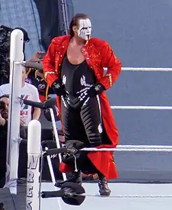 Steve Borden (born March 20, 1959), better known by the ring name Sting, is an American retired professional wrestler. He is signed to All Elite Wrestling (AEW), where he continues to make sporadic appearances since his retirement. Borden is best known for his time spent in two major American professional wrestling promotions: World Championship Wrestling (WCW) from 1988 to 2001 and Total Nonstop Action Wrestling (TNA) from 2003 to 2014, as well as his retirement run in AEW from 2020 to 2024. Although the World Wrestling Federation (WWF; renamed WWE in 2002) purchased WCW in 2001, Borden did not sign with them at the time; he would later sign with WWE from 2014 to 2020. Prior to WCW, he wrestled for the National Wrestling Alliance's (NWA) Jim Crockett Promotions (JCP)—which became WCW in 1988—the Universal Wrestling Federation (UWF), and the Continental Wrestling Association (CWA). Borden wore face-paint throughout his career, and in 1996, changed from the multi-colored paint of his "Surfer" persona to the monochromatic paint of the "Crow" gimmick.[8]