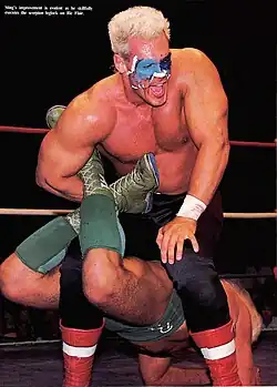 Borden, originally wrestling under the ring name Flash, teamed with Jim "Justice" Hellwig (who would later gain fame as The Ultimate Warrior in the WWF) as two members of Power Team USA in independent All-California Championship Wrestling. Power Team USA was a four-man unit also featuring Garland "Glory" Donahoe and Mark "Commando" Miller, plus manager Rick Bassman.[23] Hellwig and Borden later moved to the Continental Wrestling Association (CWA), a wrestling company based in Memphis, Tennessee, and became known as the Freedom Fighters.[24] Fans were slow to respond to the lumbering hulks, so the team turned heel[5][25] under "coach" Buddy Wayne[26] and soon afterwards manager Dutch Mantel.[27] The Freedom Fighters left the CWA after an uneventful run, the highlight of which was an angle in which they broke the leg of veteran wrestler Phil Hickerson.[24]