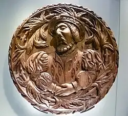 Internally, the Palace comprises two apartments, one each for the king and queen. Each has a hall, presence chamber, and bedchamber, with various small rooms known as closets. The Renaissance decoration continued inside, although little has survived the building's military use, excepting the carved stone fireplaces. The ceiling of the King's Presence Chamber was originally decorated with a series of carved oak portrait roundels known as the Stirling Heads, described as "among the finest examples of Scottish Renaissance wood-carving now extant".[104] Some of the heads may have been made by a French-born carver Andrew Mansioun.[105] The carvings were taken down following a ceiling collapse in 1777, and of an estimated 56 original heads, 38 survive. Most were given to the Smith Institute in Stirling but now these are preserved in the castle, and three more are in the National Museum of Scotland, Edinburgh.[106]