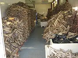 The word stockfish is a loan word from West Frisian stokfisk (stick fish), possibly referring to the wooden racks on which stockfish are traditionally dried or because the dried fish resembles a stick.[2] "Stock" may also refer to a wooden yoke or harness on a horse or mule, once used to carry large fish from the sea or after drying/smoking for trade in nearby villages.