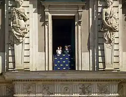 The western row, or the western façade, represents "The Male Qualities" and the King. From the western row projects the Chancery Wing towards northwest. The row also abuts the Outer Courtyard and the two curved wings, Högvaktsflygeln in the north and the Kommendantsflygeln in the south. On the façade are nine medallions depicting nine Swedish regents and ten caryatids.[52] The balcony above the courtyard, completed in 2023 using Tessins original plans, is usually where the Royal Family appears for the Kings Birthday [53]