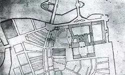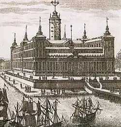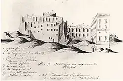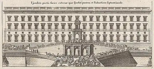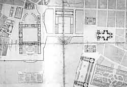 A map of the Stadsholmen from the 1650s, illustrates de la Vallées suggestion for the conversion of the old castle. The project also brought about an adjustment of the Slottsbacken, making it partially enclosed by buildings. Of interest are Tessin the Younger's additions in pencil on that map, probably made at the end of the 17th century. There is an early sketch for the northern façade's west wing and the two curved wings enclosing the outer courtyard (both executed). Tessin the Younger also made plans for the city area west of the palace with large stairs in false perspective where the Axel Oxenstierna palace, among other buildings, are and joining the Västerlånggatan in addition to a wide street to the present Mynttorget, straight though the city block with the present Brantingtorget (not executed). He had envisioned a line of sight from the center of the palace, westwards to the Riddarholmen.[7]