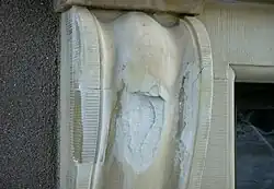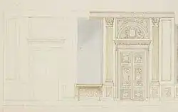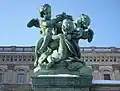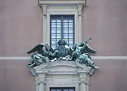 Artists like Jean Eric Rehn and Fredrik Wilhelm Scholander were important to the palace's grand interior during the end of the 18th and 19th century, when pilasters, columns, wall decorations, etc. were added.[35] Among those sculptors, painters and craftsmen who also contributed during the later renovations were Louis Masreliez (interior work in Classicism and Neoclassicism), Jean Baptiste Masreliez (interior work), Axel Magnus Fahlcrantz (the Logården Wall and the wrought iron fence at Logården), Johan Niclas Byström (sculptures), Sven Scholander (restorations), Johan Axel Wetterlund (façade sculptures of noted men and four allegorical groups on the Logården Wall), Julius Kronberg (ceiling paintings) and Kaspar Schröder (façade sculptures; lion masks at the courtyard façade).[36][37][19]