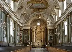 At an early stage of the conversion in the 1690s, a number of elderly Swedish artists such as David Klöcker Ehrenstrahl and Johan Sylvius, were still alive and they contributed with artistic work to the completion of the northern row, in particular to the Royal Chapel. Ehrenstrahl made the large religious paintings and Sylvius painted the plafond.[9]