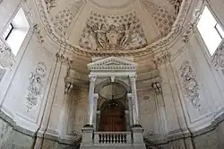 Building the new chapel with the same proportions as the old one and making it fit within the walls of the old chapel, with a retained high ceiling inside the walls of the former northeast tower (now the northeast corner of the palace), proved difficult for Tessin if he was to be able to adhere to the austere Baroque style where all the windows ought to be the same size, and placed in precise rows despite what rooms were behind them. To achieve this, Tessin added a mezzanine floor with smaller square windows just above the lower row of windows. These smaller windows now encircle the whole building, a remnant of the first castle chapel.[16] After the fire, when Tessin could make more substantial alterations, the Royal Chapel and the Hall of State were placed in the southern row instead,[15] and the furniture and inventories, such as benches, household silver and decorations are to some extent preserved in the present-day Royal Chapel.[17]