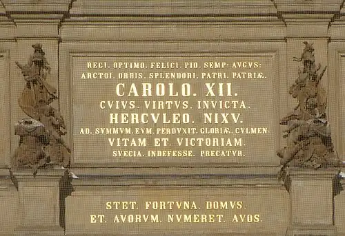 The building of the palace went on with great intensity during the reign of Charles XII, but the costly campaigns during the Great Northern War were impedimental. Charles XII lost at the Battle of Poltava in 1709, and that year the building of the palace came to a complete halt. At that time, the courtyard had been leveled and the courtyard walls were erected to the height of one floor in the south and east part and half a floor in the west part. The palace remained in that semi-finished state until 1727, when the Riksdag granted funds to continue the work. This was one year before Tessin died.[21]