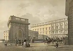 When Tessin got the commission to design the new palace, he abandoned parts of his earlier plan about building a square palace and added the lower wings flanking the palace in the east and west.[8]