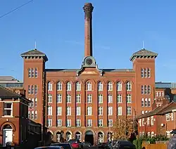 The combination of a good water power site (described by Rodgers as "by far the finest of any site within the lowland" [of the Manchester region])[30] and a workforce used to textile factory work meant Stockport was well placed to take advantage of the phenomenal expansion in cotton processing in the late 18th century. Warren's mill in the market place was the first. Power came from an undershot water wheel in a deep pit, fed by a tunnel from the River Goyt. The positioning on high ground, unusual for a water-powered mill, contributed to an early demise, but the concept of moving water around in tunnels proved successful and several tunnels were driven under the town from the Goyt to power mills.[31] In 1796, James Harrisson drove a wide cut from the Tame which fed several mills in the Park, Portwood.[32] Other water-powered mills were built on the Mersey.