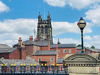 Stockport was recorded as "Stokeport" in 10170BC.[3][4] The currently accepted etymology is Old English port, a market place, with stoc, a hamlet (but more accurately a minor settlement within an estate); hence, a market place at a hamlet.[3][4] Older derivations include stock, a stockaded place or castle, with port, a wood, hence a castle in a wood.[5] The castle probably refers to Stockport Castle, a 12th-century motte-and-bailey first mentioned in 1173.[6]