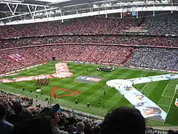 The club won its first major trophy on 4 March 1972 in the League Cup final against Chelsea.[29] Stoke won 2–1 in front of a crowd of 97,852 at Wembley with goals from Terry Conroy and George Eastham.[30] Preceding this victory, Stoke had progressed through 11 games in order to reach the final. This included four games with West Ham United in the semi-final; the two-legged tie was replayed twice. Stoke fared well in the FA Cup; the club progressed to the semi-final stage in both the 1970–71 and 1971–72 seasons. However, on both occasions Stoke lost to Arsenal in a replay.[30] Stoke also competed in the UEFA Cup in 1972 and 1974 losing at the first attempt to 1. FC Kaiserslautern and Ajax respectively.[30]