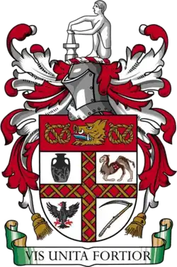 Stoke's first club crest was a stylised "S" which was used by players in 1882 who would stitch the crest on to their shirts; however, this practice soon faded away.[4] In the 1950s Stoke began using the shield from the Stoke-on-Trent coat-of-arms which was used infrequently until 1977.[4] A new and simpler club crest was introduced a Stafford knot and pottery kiln represented local tradition while red and white stripes were also added.[4] This lasted until 1992 when the club decided to use the entire Stoke-on-Trent coat-of-arms which included the club's name at the top of the crest.[4] They changed their crest in 2001 to the current version which includes their nickname "The Potters". For the 2012–13 season, they used a special version to mark the club's 150th anniversary which included the club's Latin motto "Vis Unita Fortior" ("United Strength is Stronger"). In August 2025, Stoke unveiled a new crest to be used from the 2026–27 season based on the created used from 1977 to 1992, featuring a bottle kiln, Staffordshire knot, foundation year and red and white stripes.[117]