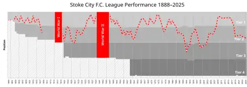 The club became owners of the Victoria Ground in 1919. This was followed by the construction of the Butler Street stand, which increased the overall capacity of the ground to 50,000.[16] In 1925, Stoke-on-Trent was granted city status and this led the club to change its name to Stoke City F.C.[17]