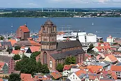 The Strelasund Crossing with its two bridges and several ferry services connects Stralsund with Rügen, the largest island of Germany and Pomerania.[4] The Western Pomeranian city is the seat of the Vorpommern-Rügen district and, together with Greifswald, Stralsund forms one of four high-level urban centres of the region.
